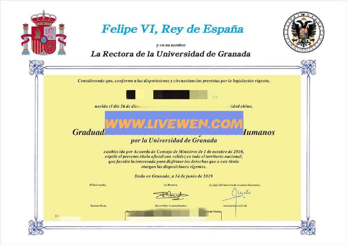 格拉纳达大学毕业证、西班牙临时毕业证明、Universidad de Granada diploma、西班牙硕士学位证书购买、办理留信认证网络可查。