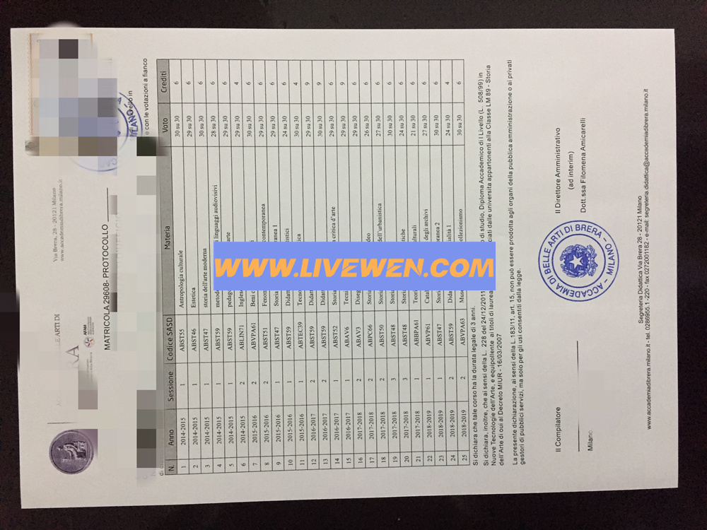 米兰布雷拉美术学院毕业证、米兰布雷拉国立美术学院成绩单、Accademia di belle arti di Brera transcript、意大利大学成绩单。
