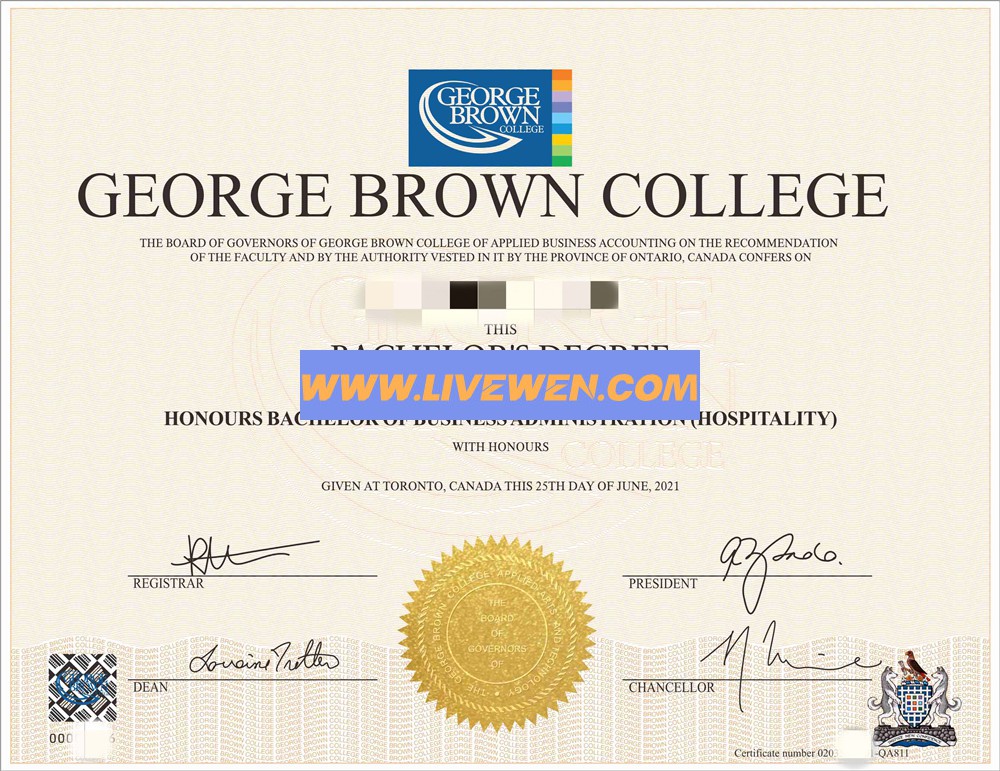、George Brown文凭证书样本、学历证书电子版《办 乔治布朗学院学历证书》、乔治布朗学院毕业证模板|George Brown成绩单防伪水印|加拿大学历认证